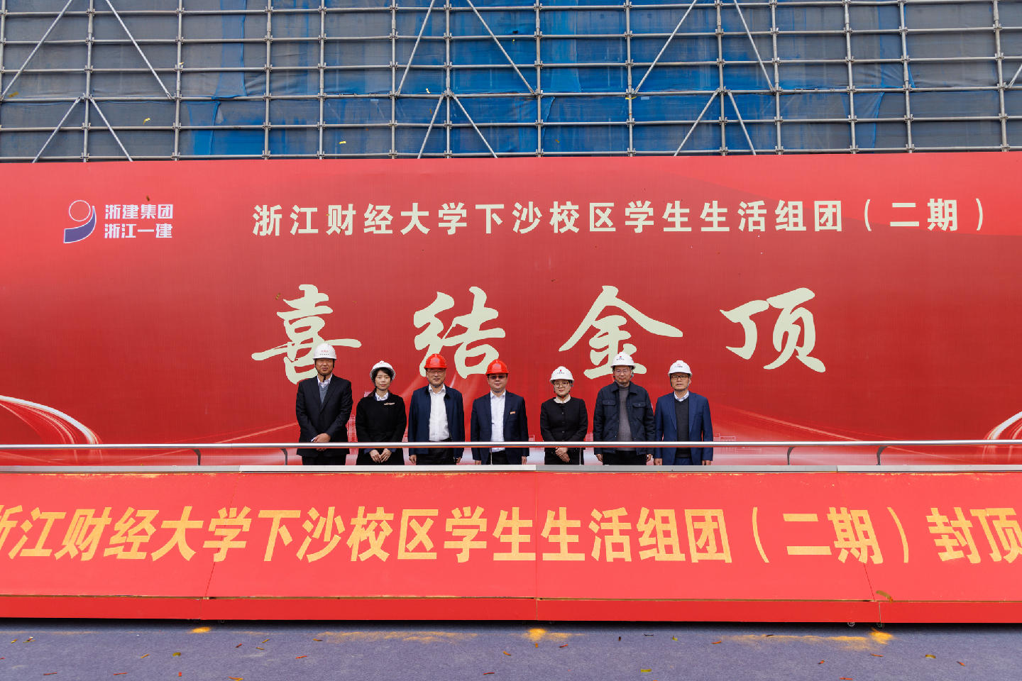 3月26日上午11时18分,浙江财经大学下沙校区学生生活组团(二期)项目在施工现场举行封顶仪式。浙江财经大学校长陈衍泰、校党委副书记徐晓东、施工单位、监理单位、设计单位、审计单位、学校师生代表以及现场施工的工友们齐聚现场,共同庆贺这一重要建设节点的顺利达成。封顶仪式由徐晓东党委副书记主持。