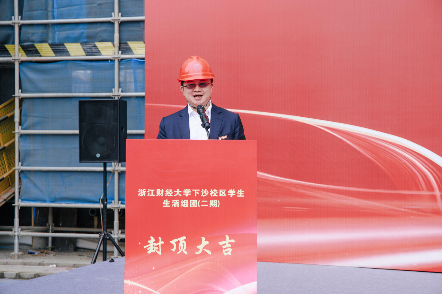 校长陈衍泰在仪式上发表讲话。他表示,项目自奠基以来不到一年实现主体封顶,离不开各参建单位与建设者的辛勤付出。作为学校高水平大学建设“一校一策”方案重点建设项目,该项目建成将进一步拓展办学空间,为实施 “新财经战略”、建设特色鲜明一流财经大学提供坚实支撑。陈校长要求各参建要坚守质量底线、筑牢安全防线、紧盯进度目标,同心协力打造安全可靠的精品工程、人心工程,为财大学子营造优质舒适的住宿环境,助力学校高质量发展。